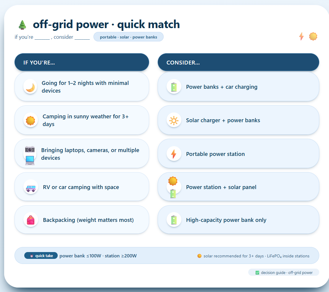 Not every camper needs a power station. Not every trip demands solar panels. Here’s a quick guide:
